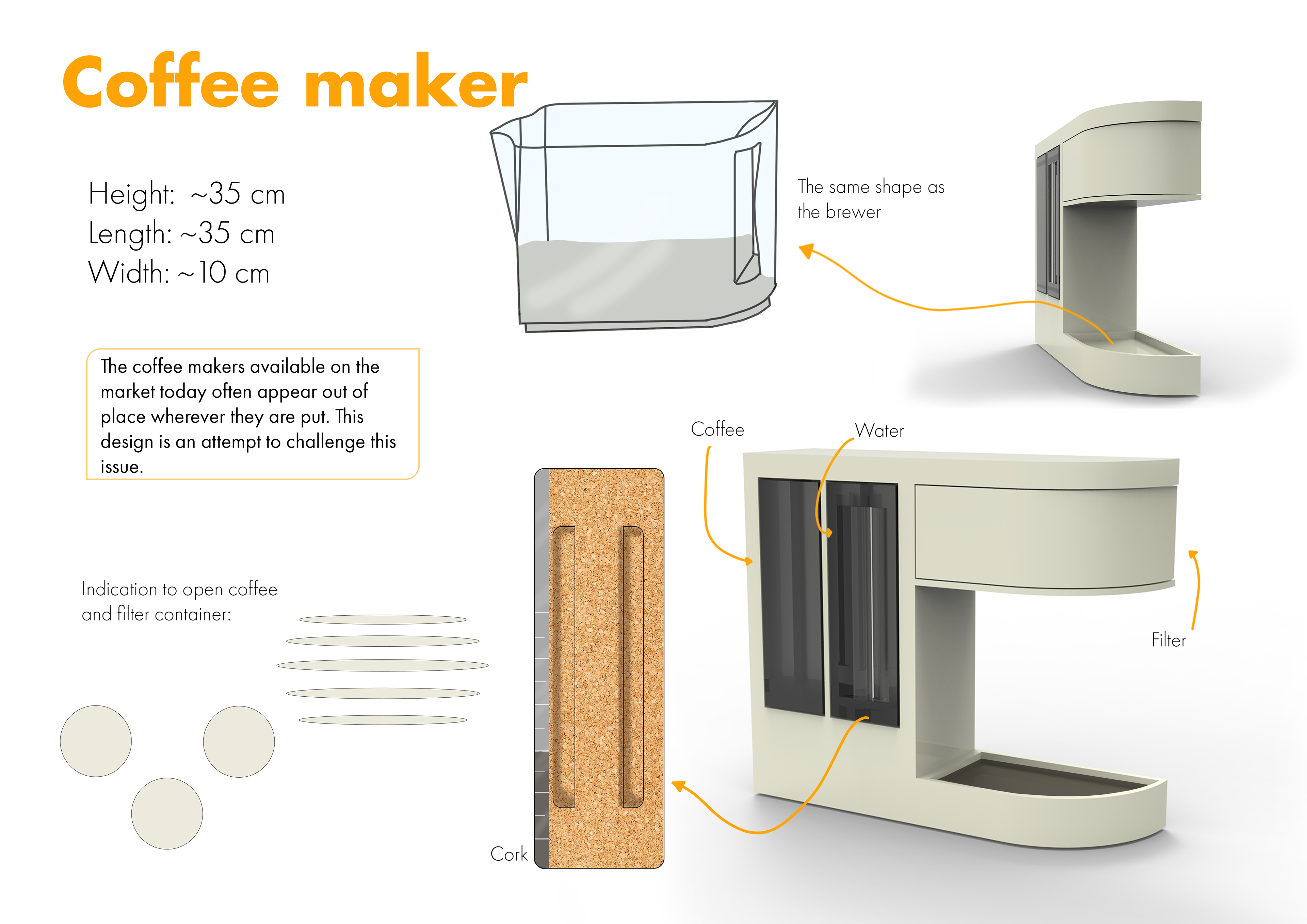 I wanted to create a coffee maker that feels thoughtful, sustainable, and easy to place in the kitchen. In my opinion, many coffee makers are hard to position naturally on a counter, and they often feel cheap or disposable.