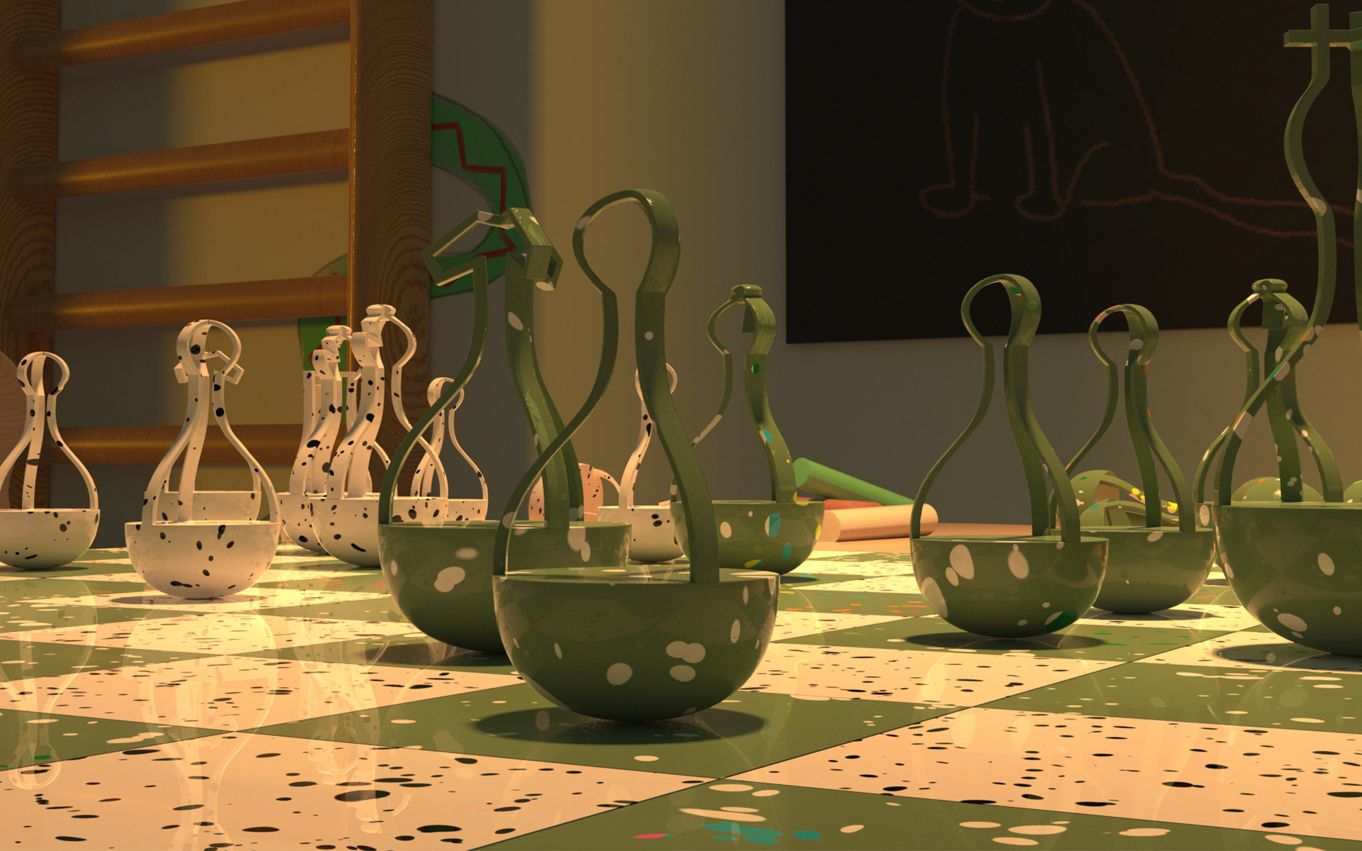 All pieces and their custom environment were surface-modeled in Autodesk Alias and rendered in KeyShot. I chose to create a playful surrounding where the chess pieces it thought to be used by kids and encourage the game.