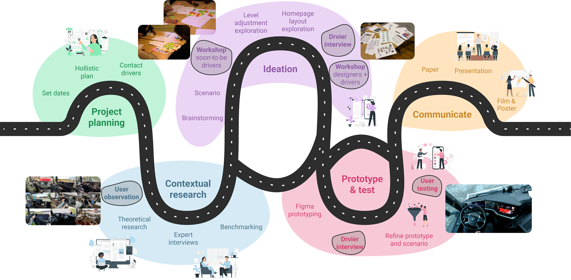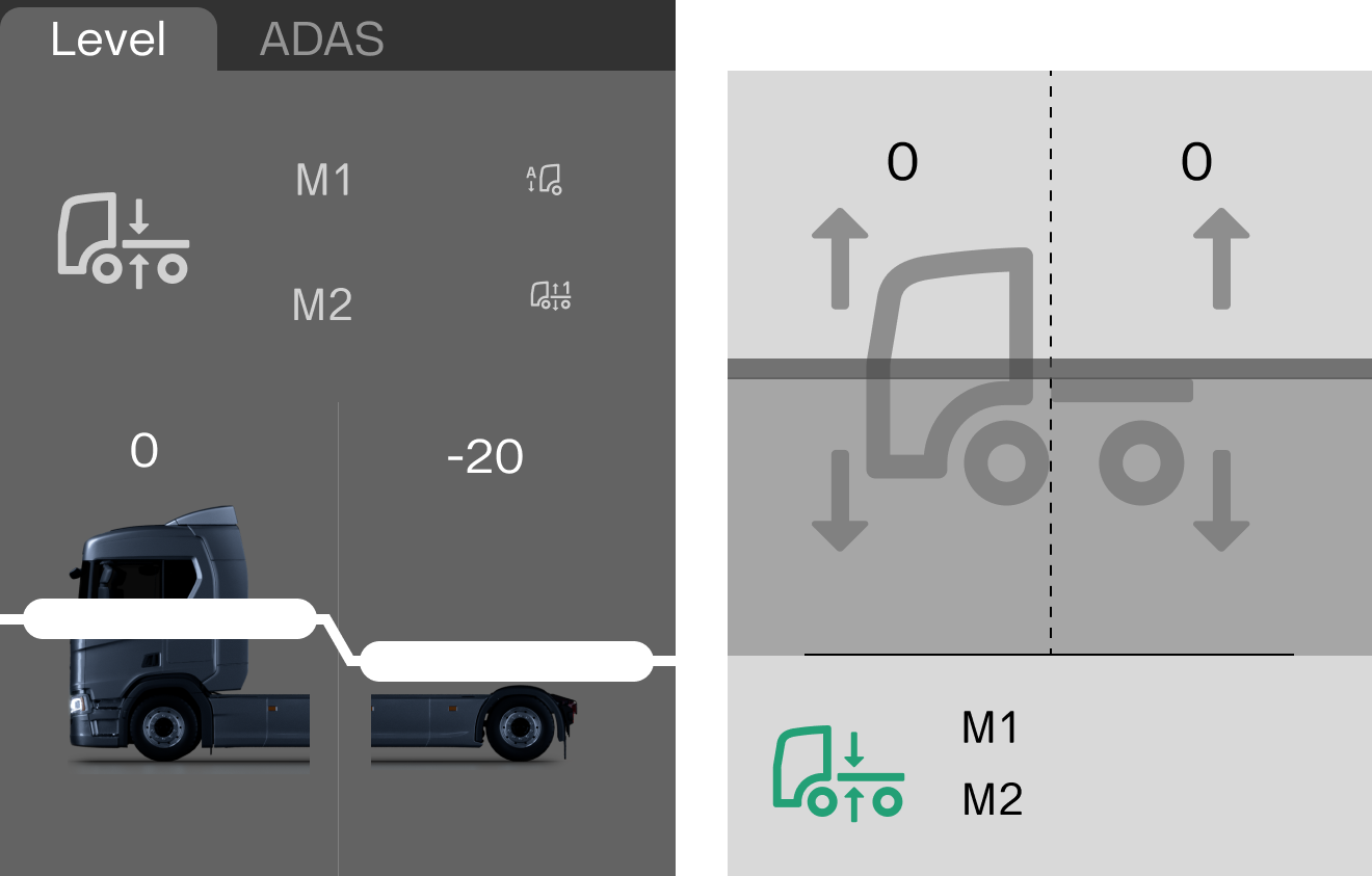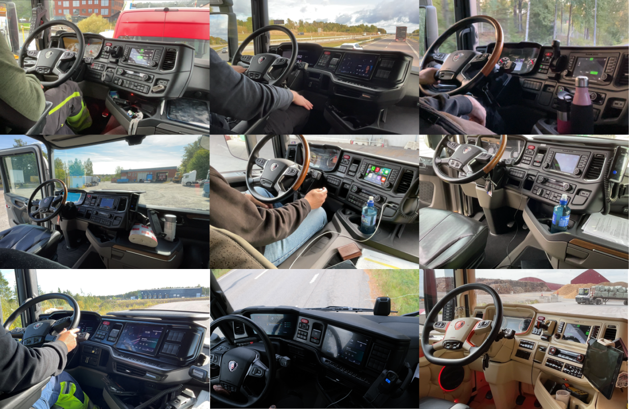 To understand how drivers interact with digital systems in real contexts, I conducted contextual research combining ride-along observations and informal interviews with ten truck drivers and expert sessions in interaction design and human factors. The observations provided insight into everyday practices and highlighted how digital needs differ between truck types and tasks—for instance, the relevance of functions like power take-off varies significantly between a timber truck and a tractor-trailer. Across all methods, clear patterns emerged: drivers need predictable interaction flows, adaptable interfaces that support different workflows, and quick access to essential functions within 1–2 steps. Environmental conditions such as vibration, lighting, and glove use further emphasized the importance of clear hierarchy and sufficiently large touch targets.